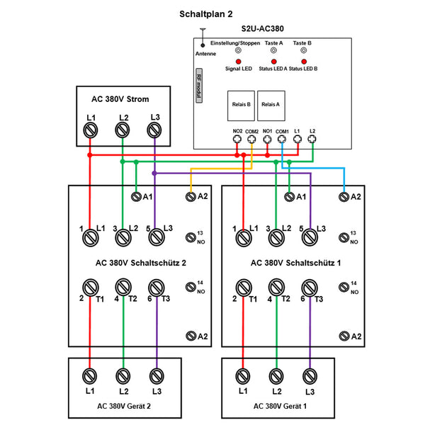 2) Wenn Sie das AC 380V Gerät steuern möchten, können Sie den Empfänger, das 380V Schütz, das 380V Gerät und die 380 V Stromversorgung gemäß dem folgenden Schaltplan 2 anschließen. Anschließend können Sie das AC 380V Gerät mit dem Sender steuern.