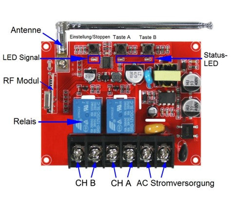 Relaisausgang: Der Empfänger ist Relaisausgang. Es können zur Steuerung DC und AC Geräte verwendet werden. Die Klemmen sind NO / NC (normalweise geöffnet / normalweise geschloßen) und es ist wie ein Funkschalter. Es bedeutet, dass Sie auch eine separate Stromversorgung an Geräte anschließen sollen.