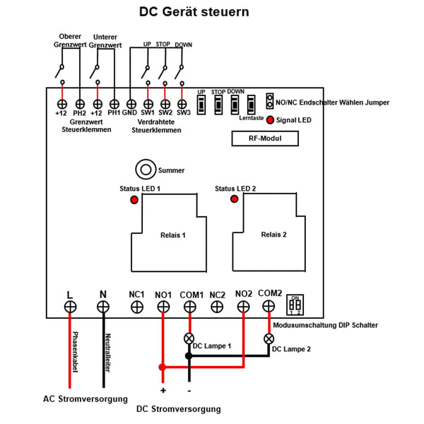 Wenn Sie eine DC Lampe steuern möchten, machen wie folgende. Bitte beachten Sie das Anschlussdiagramm.