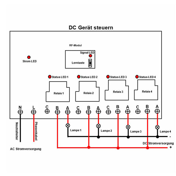 Relaisausgang: Dieser Empfänger ist der trockene Relaisausgang, es können zur Steuerung DC und AC Geräte verwendet werden.