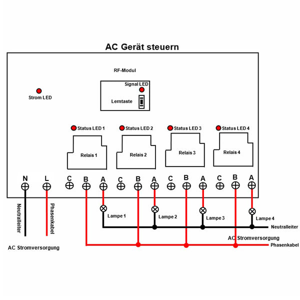 2.2 Verbinden Klemme <B> an das Phasenkabel der AC Stromversorgung, Verbinden Klemme <A> an eine Seite von AC Lampe, und Verbinden andere Seite von AC Lampe an Neutralleiter der AC Stromversorgung.