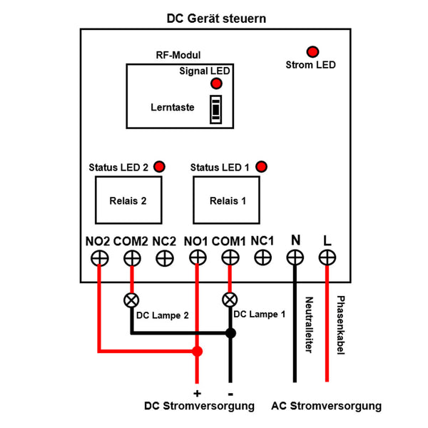 2.2 Verbinden Klemme <NO> an das Phasenkabel der AC Stromversorgung, Verbinden Klemme <COM> an eine Seite von AC Lampe, und Verbinden andere Seite von AC Lampe an Neutralleiter der AC Stromversorgung.