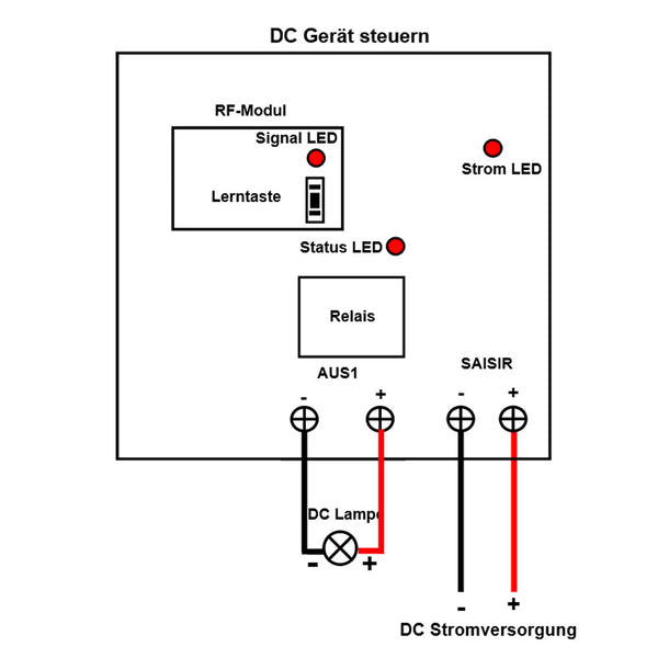 2) Verbinden Klemme <+> des AUS1 an Pluspol von DC Lampe, Verbinden Klemme <-> des AUS1 an Minuspol von DC Lampe.