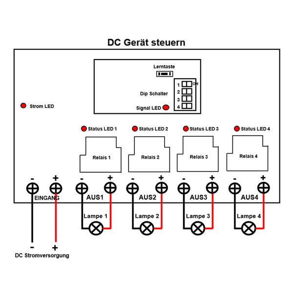 Drücken Sie Taste A → Klemme <AUS1> ausgang DC Stromversorgung (Gerät 1 EIN); Die andere 3 Klemmen stoppen die Ausgabe (die andere 3 Geräte AUS).
