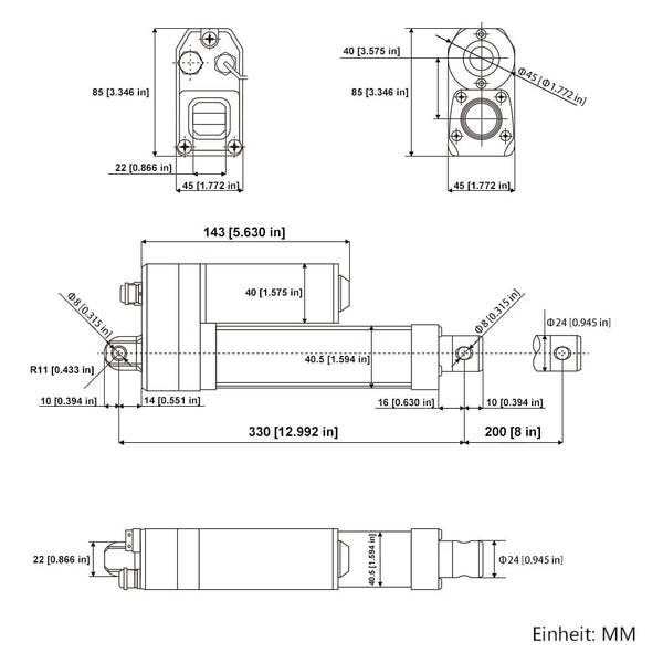 Einzugslänge: Wenn der Linearantrieb vollständig eingefahren ist, beträgt der Mittenabstand zwischen den beiden Montagelöchern 330 mm.