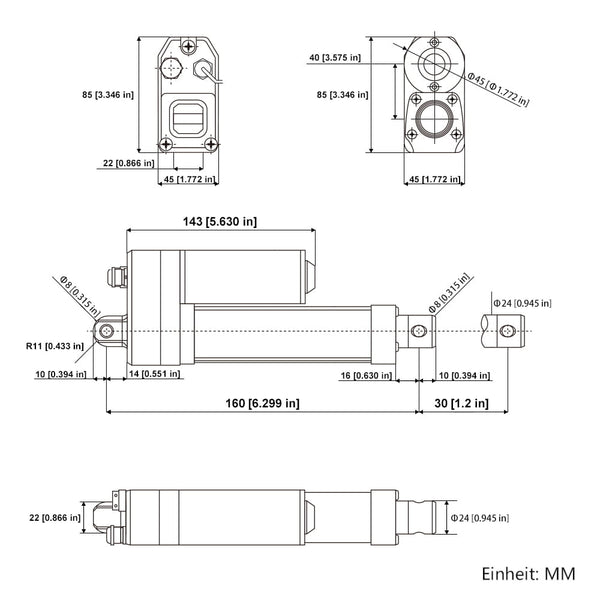 Einzugslänge: Wenn der Linearantrieb vollständig eingefahren ist, beträgt der Mittenabstand zwischen den beiden Montagelöchern 160 mm.