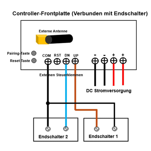 2) Verbinden Sie zwei normalerweise offene Klemmen eines Endschalters an die Klemmen <UP> und <COM>, und Verbinden Sie zwei normalerweise offene Klemmen eines anderen Endschalters an die Klemmen <DOWN> und <COM>.