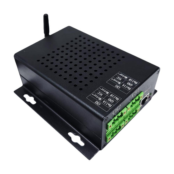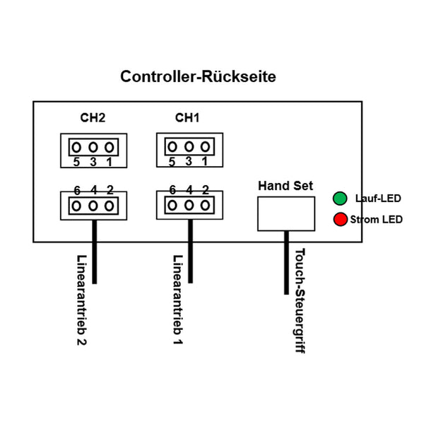 2) Wie in der Abbildung gezeigt, stecken Sie die zwei Klemmen des ersten Linearantriebs in die zwei Anschlüsse von CH1 des Controllers und stecken Sie die zwei Klemmen des zweiten Linearantriebs in die zwei Anschlüsse von CH2 des Controllers.