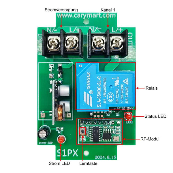 1) Einstellung der Modus Momentan: Drücken Sie die Lerntaste im Empfänger 2 Mal, die Signal-LED blinkt kontinuierlich 2 Mal und erlischt dann.